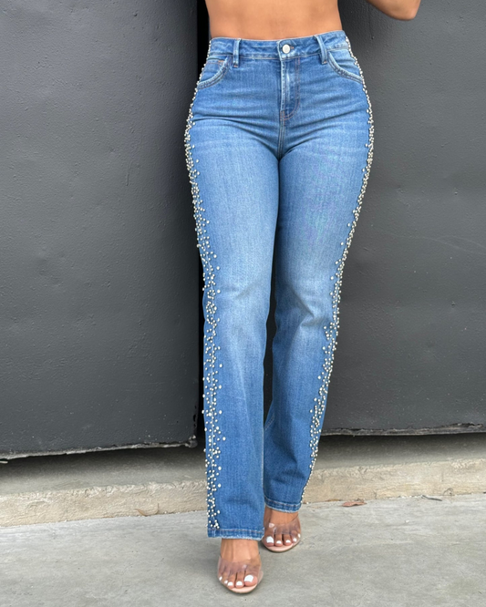 Calça Jeans Feminina Cintura Alta com Pernas Largas e Bolsos Múltiplos