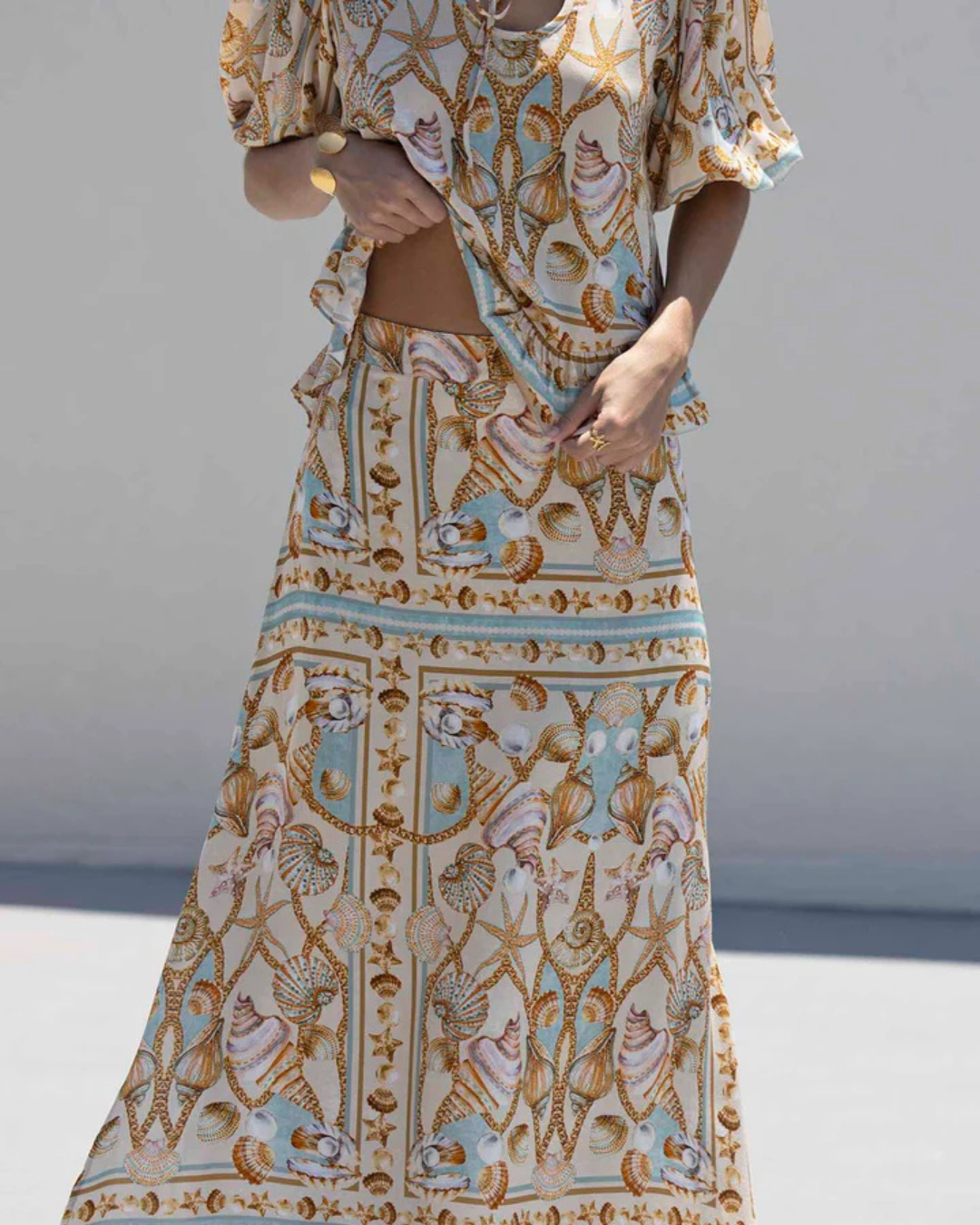 Deixe-se envolver pelo charme das estampas oceânicas com este conjunto leve e fluido. A blusa de mangas bufantes e amarração frontal traz um toque boho sofisticado, perfeito para dias ensolarados ou encontros casuais com estilo. Confortável, fresco e cheio de personalidade.