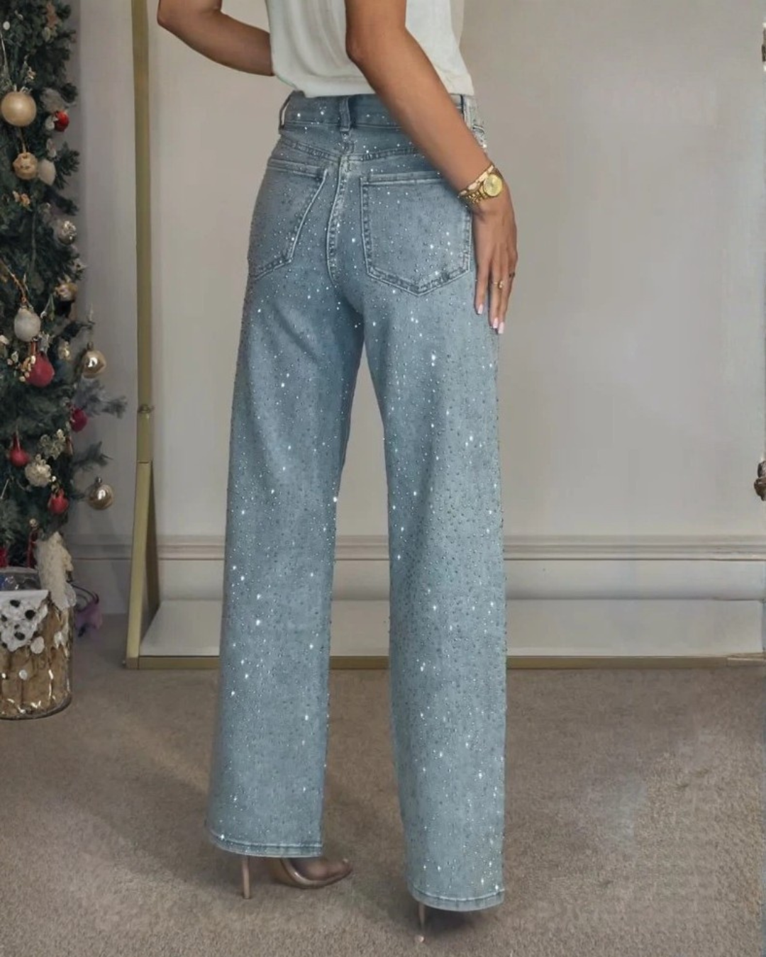 Calças de Corte Reto e Cintura Subida com Pormenores Brilhantes para Mulher