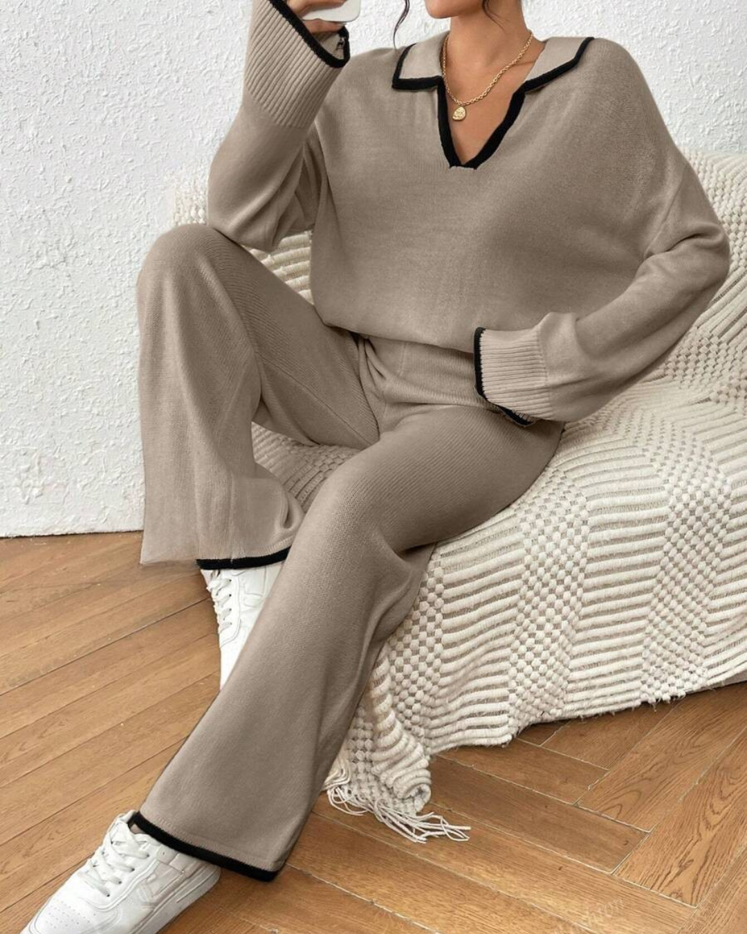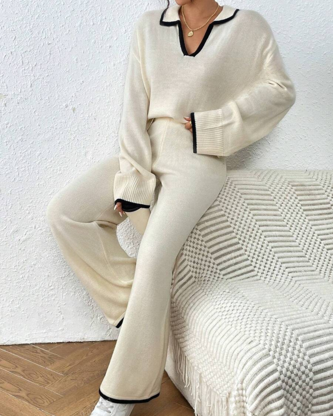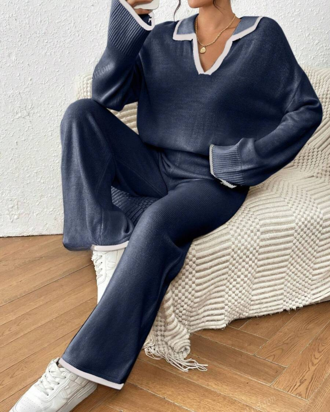 Conjunto de Camisola e Calças de Malha de 2 Peças com Acabamento em Cor Contrastante