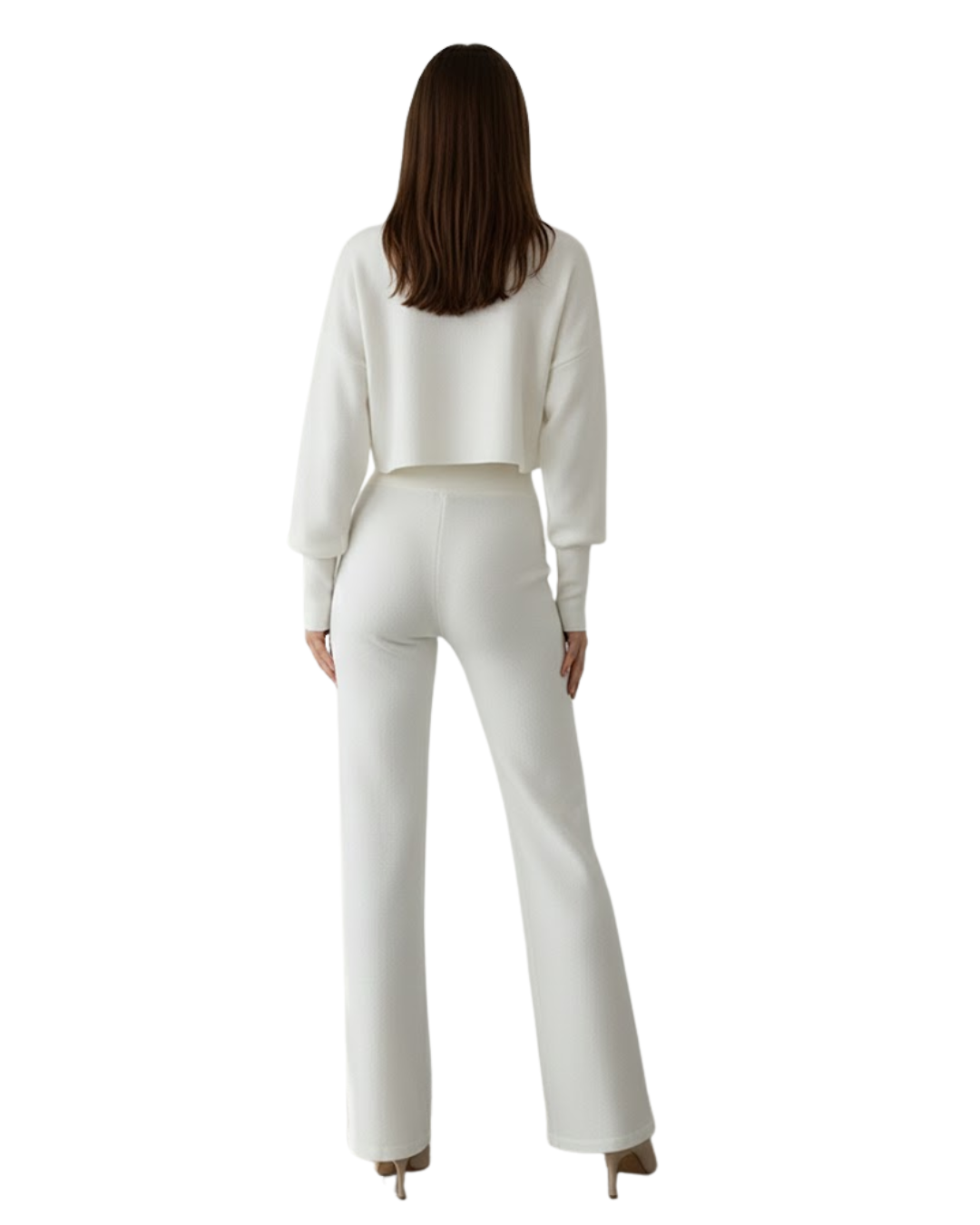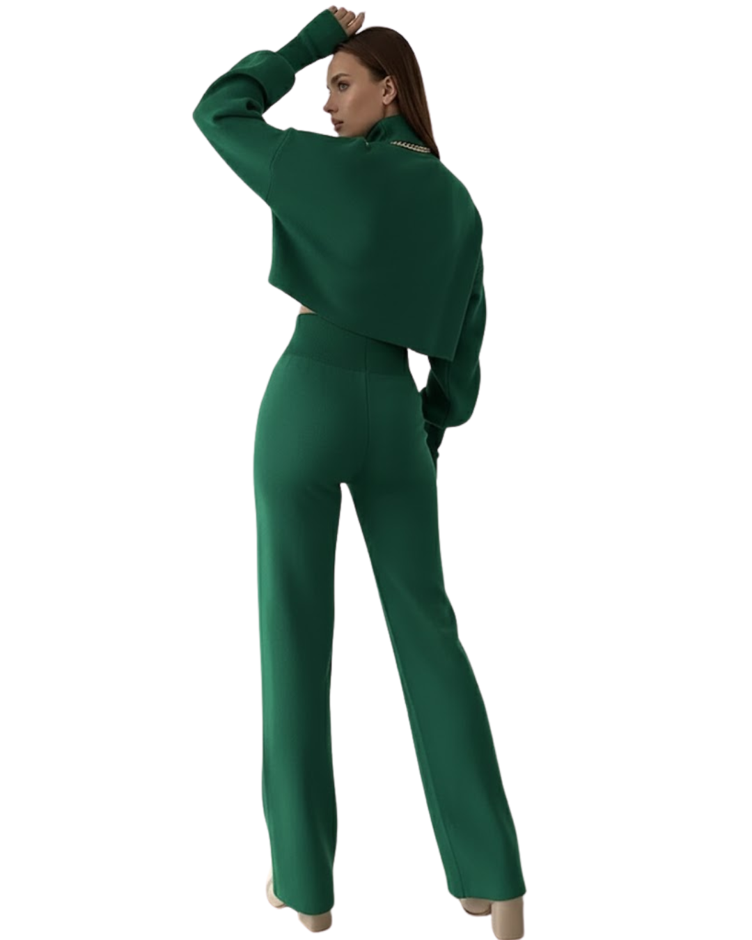 Este conjunto elegante apresenta um coordenado moderno, composto por um top curto e umas calças de cintura confortável. É uma combinação que oferece uma estética coesa e atual, perfeita para quem procura um estilo fácil e imediato.