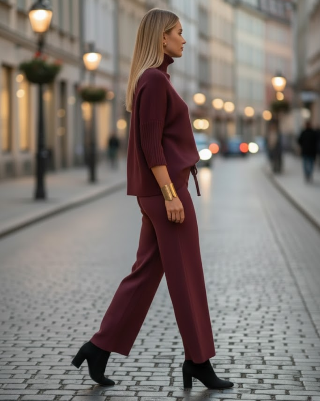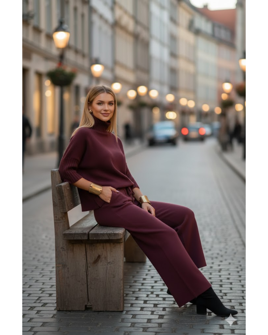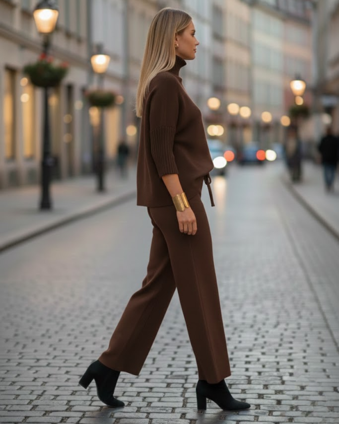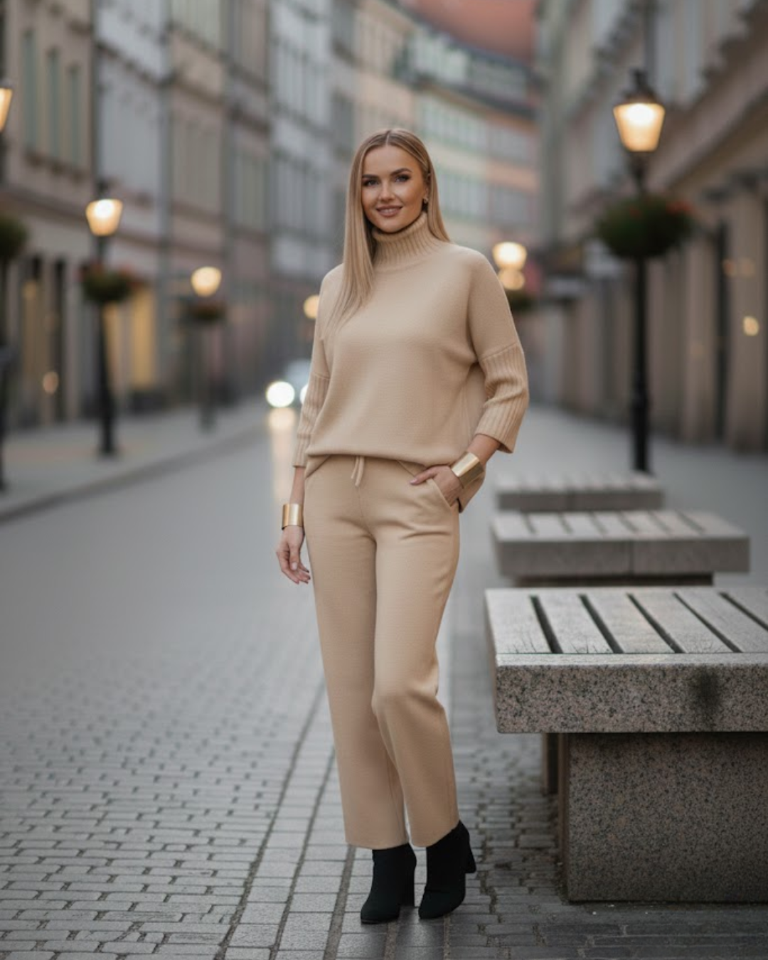 Este set destaca-se pela sua estética simples e intemporal, tornando-o um básico essencial que eleva qualquer guarda-roupa. A sua natureza minimalista facilita a combinação com outras peças e acessórios, adaptando-se sem esforço a múltiplos ambientes, desde o escritório a passeios casual.