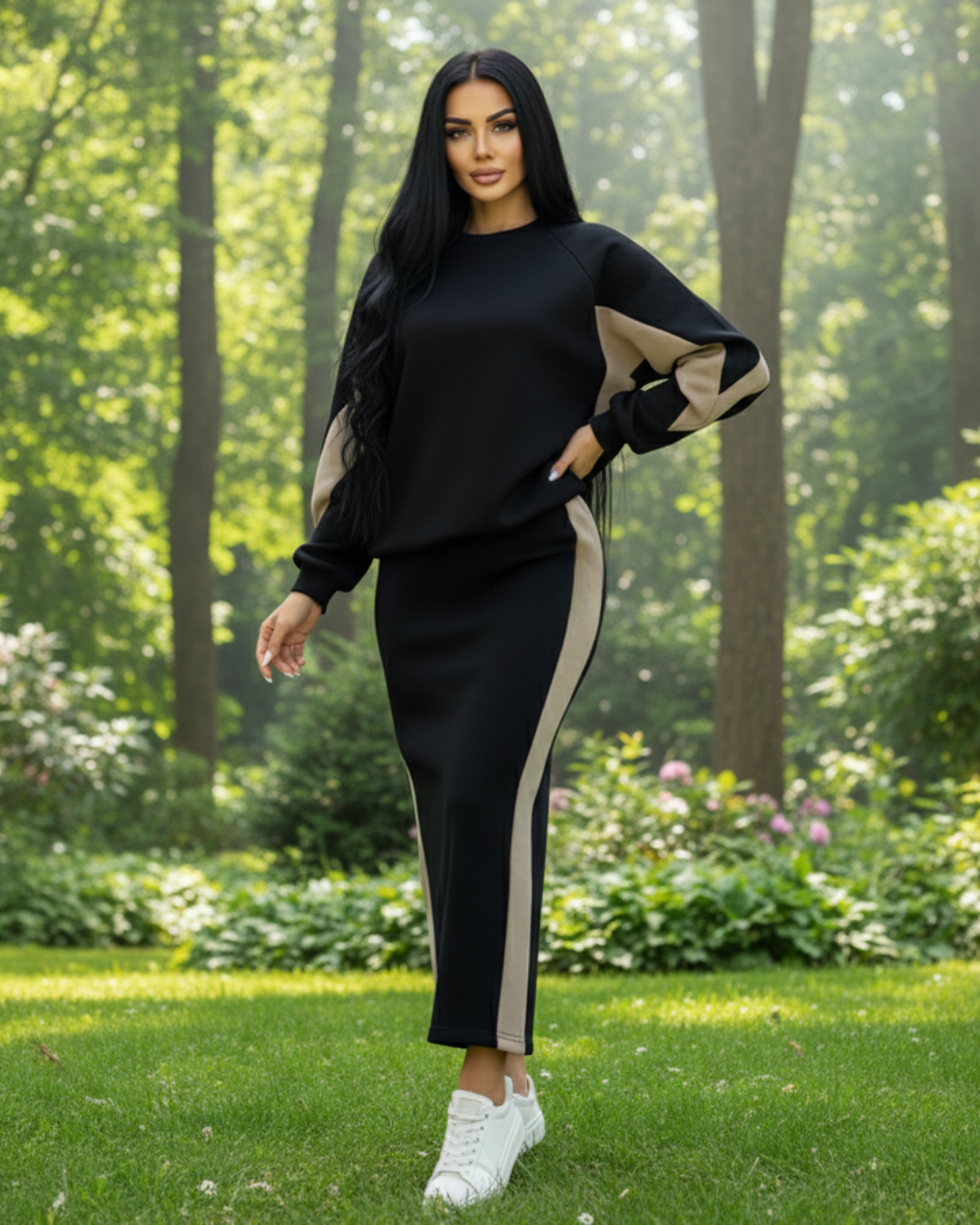 A saia com abertura lateral adiciona um toque moderno e elegante, enquanto o top solto equilibra a figura. O conjunto cria uma silhueta estilizada e atual que realça a sua figura de forma sofisticada.