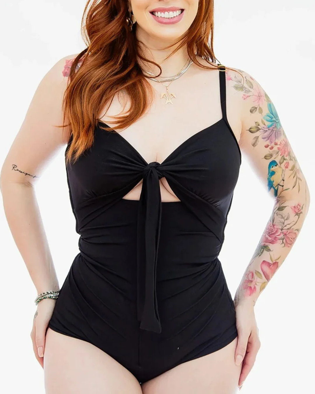 Fato de banho de apoio estratégico com uma silhueta adelgaçante.