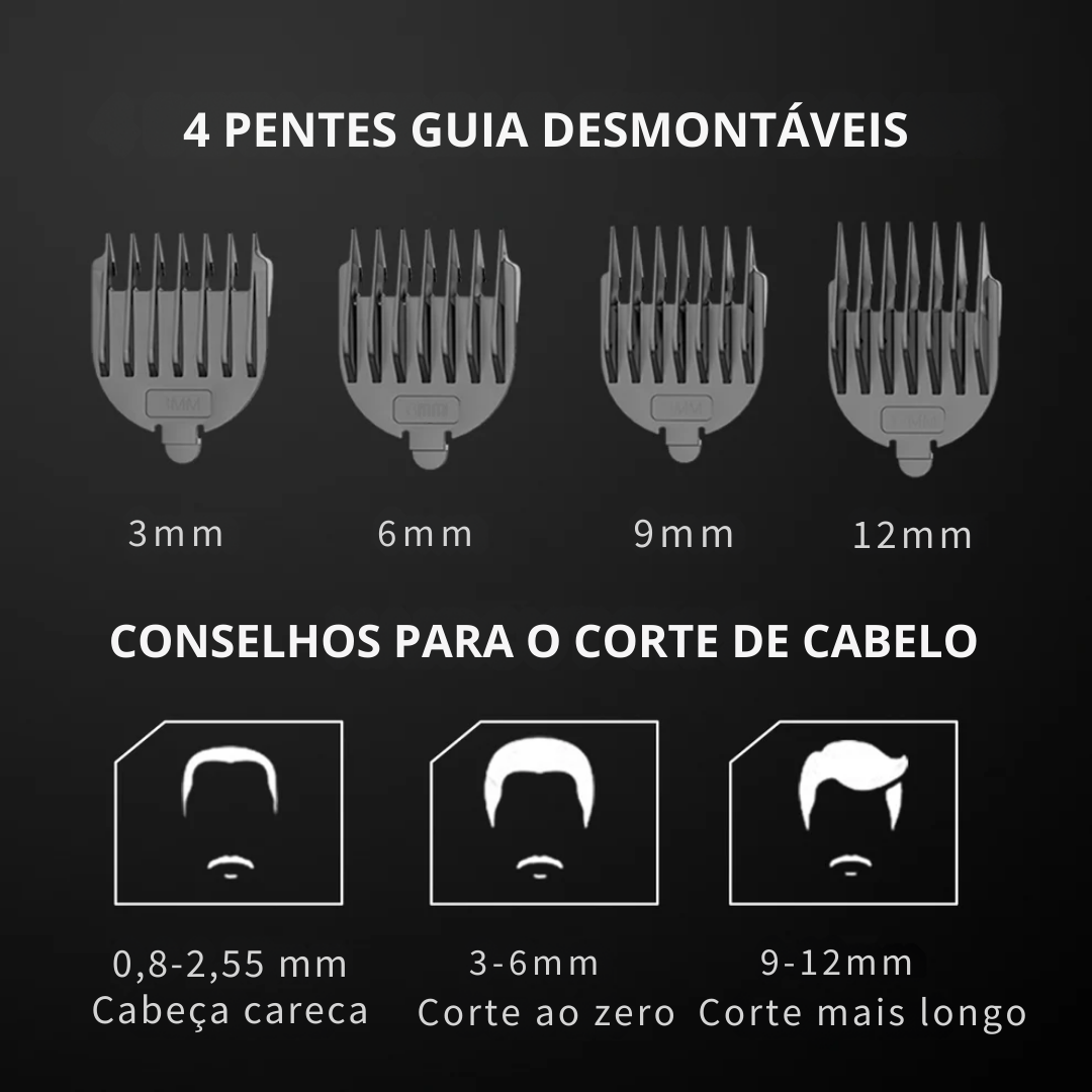 Inclui 4 pentes destacáveis (de 3 mm a 12 mm) que lhe permitem um controlo de comprimento sem esforço para obter o estilo desejado.