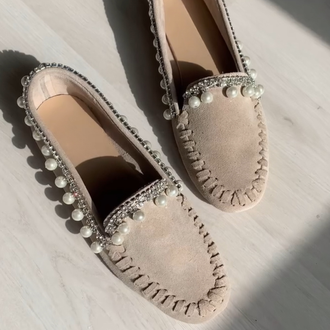 Mocassins ergonómicos com detalhes em pérolas e diamantes
