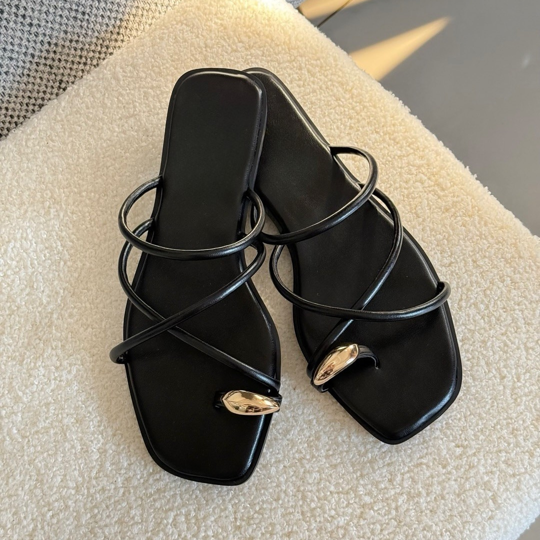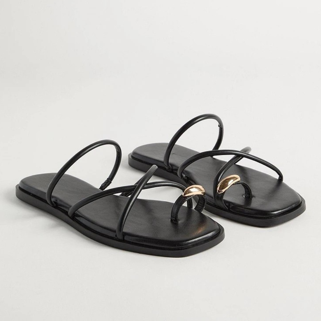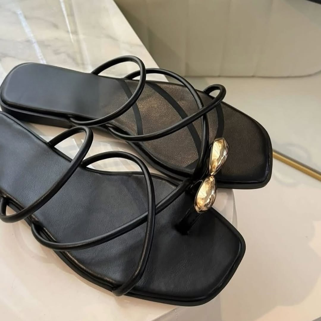 Sandália minimalista com tiras finas e elegante detalhe dourado