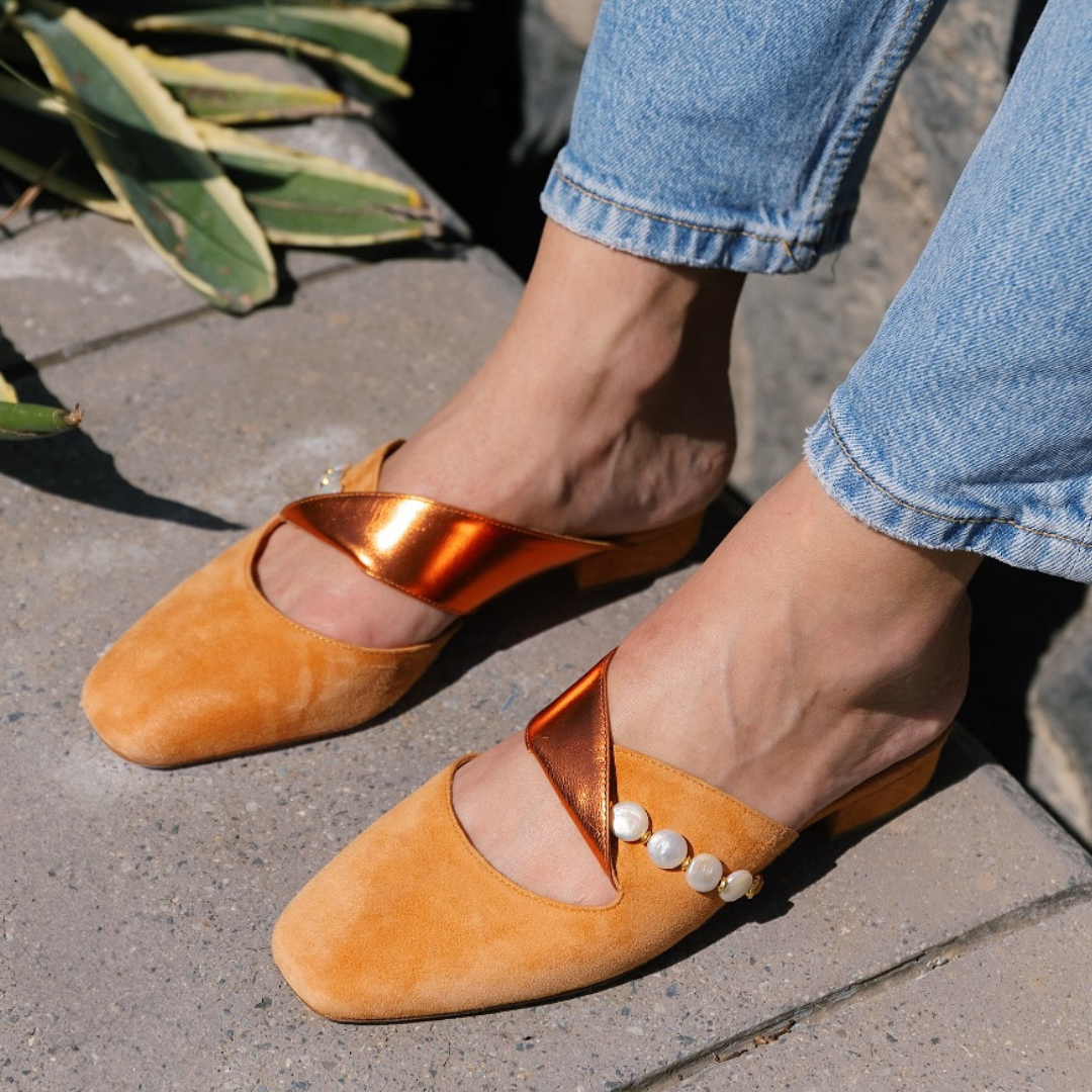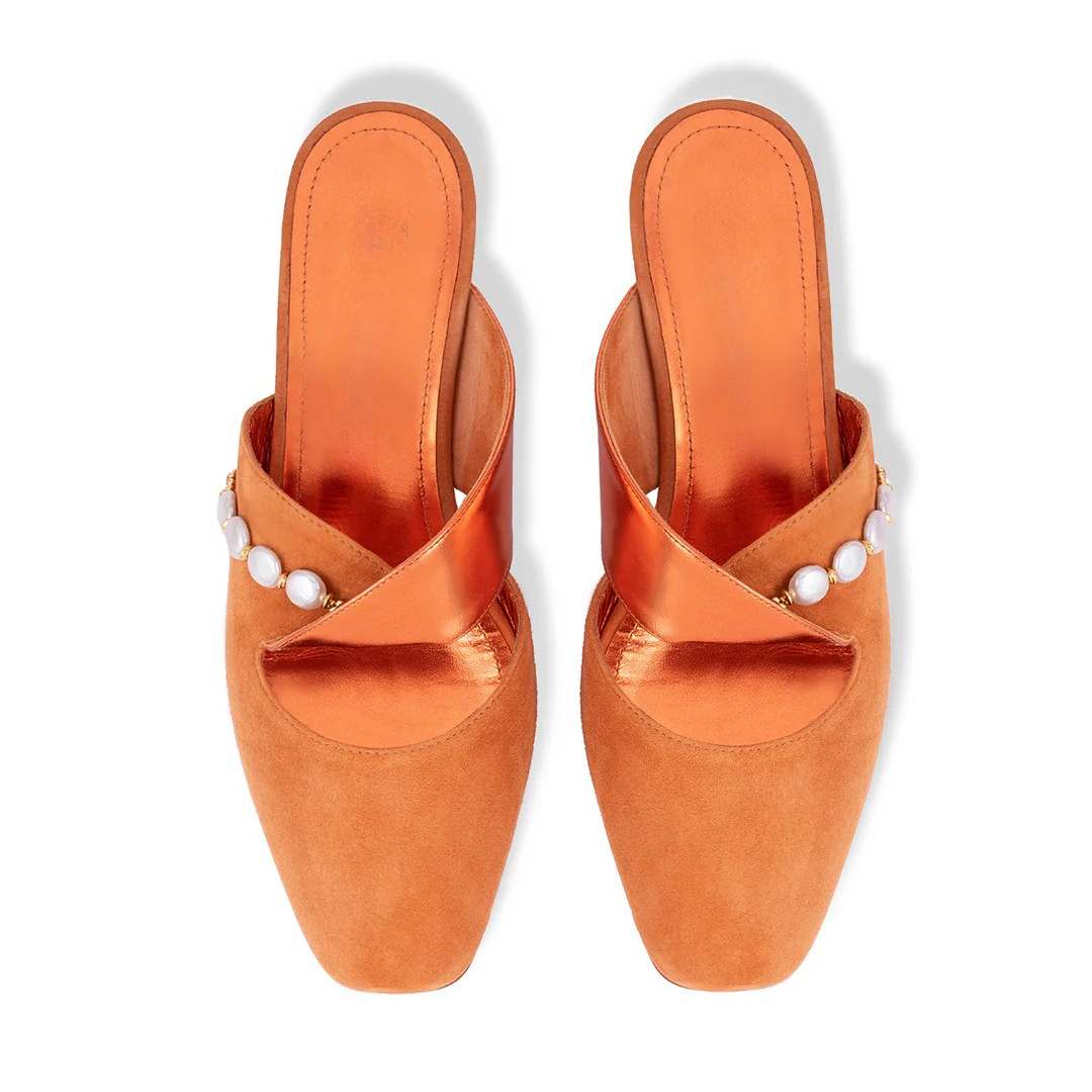 Sandálias elegantes com biqueira fechada e pérolas decorativas