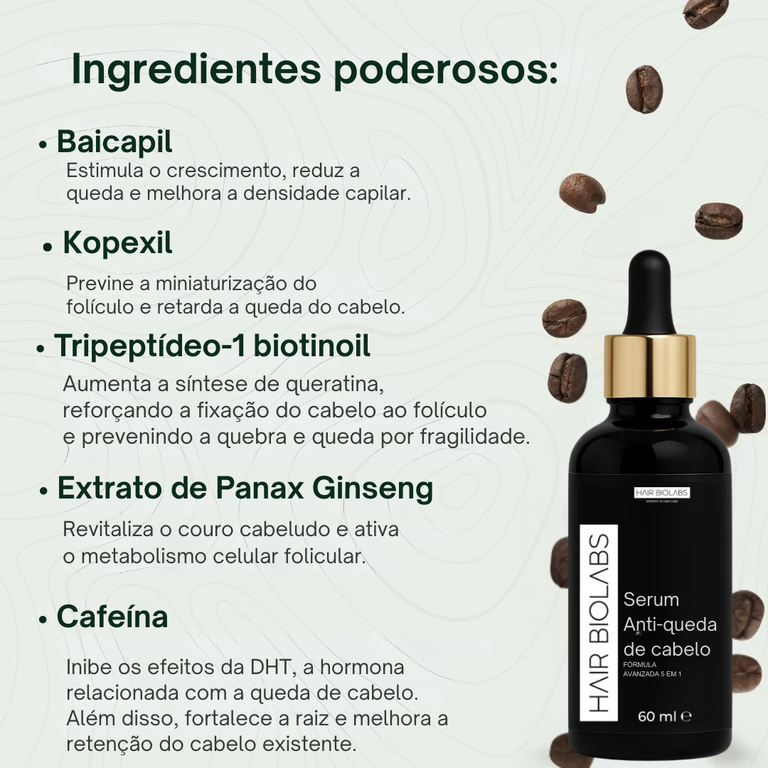 A nossa fórmula combina ingredientes poderosos como Baicapil™, Kopexil e Biotinoyl Tripeptide‑1, que atuam diretamente no folículo para estimular o crescimento, reduzir a queda e fortalecer a fixação do cabelo. Graças ao Panax Ginseng e à Cafeína, o couro cabeludo é revitalizado, a microcirculação é ativada e a ação do DHT, a hormona responsável pela queda de cabelo, é bloqueada. O resultado: um cabelo mais denso, forte e visivelmente mais saudável desde a raiz.