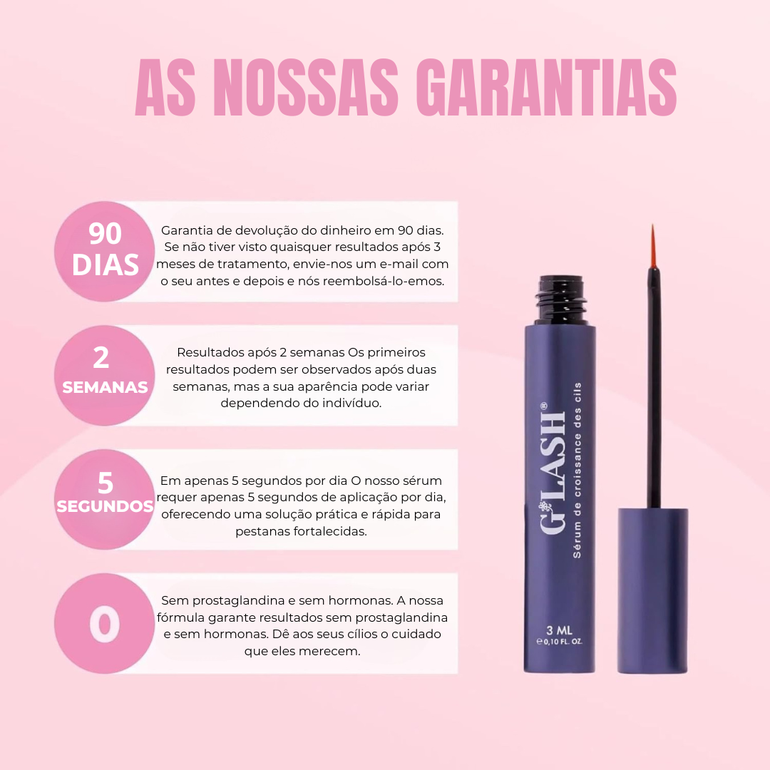 Com G'LASH, tem uma fórmula segura, sem hormonas nem prostaglandinas, que começa a mostrar resultados visíveis em apenas 2 semanas. A sua aplicação diária demora apenas 5 segundos e, se após 90 dias não notar mudanças, devolvemos o seu dinheiro. É assim tão simples e fiável.